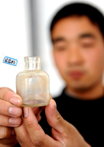 工作人員在展示一只在勘探現(xiàn)場發(fā)現(xiàn)的玻璃瓶。 李勇 攝