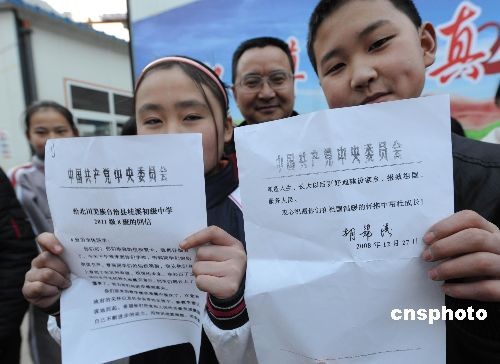 12月29日,四川地震極重災區的北川縣桂溪中學師生喜獲胡錦濤總書記的回信。吳天春校長和同學們兩天前受到胡總書記的看望,一位羌族女學生向臨告別時的總書記送上一封信和學校震后重建規劃圖的賀年片,兩天后就收到從成都轉來總書記的回信。中新社發 賈國榮 攝