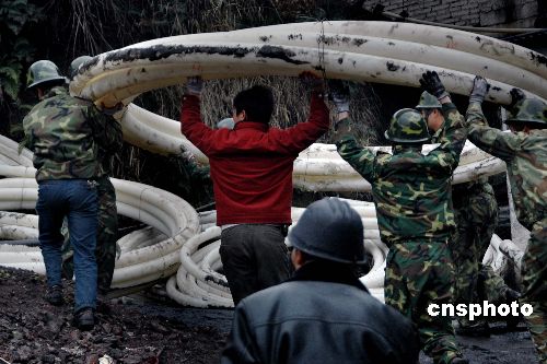 民兵分隊將抽水管抬往救援井口。