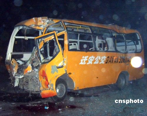 1月6日14時25分許,河北省遷安市發(fā)生一起重大交通事故。在遷安市祺光路與彭李路交叉口處,一名個體司機駕駛大貨車與遷安市公交公司13路公交車相撞,造成公交車兩名司乘人員當場死亡,在送往醫(yī)院途中死亡一人,經搶救無效死亡三人,另四名傷者正在醫(yī)院救治。 中新社發(fā) 翟羽佳 攝