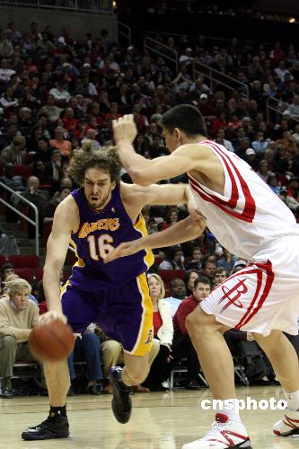 圖為姚明防守湖人隊加索爾。中新社發 歐文 攝