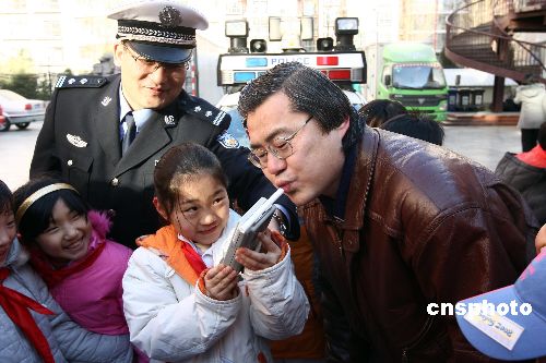 1月14日,北京崇文區交通支隊民警為崇文小學學生和家長講授交通安全課,家長當場向自己的孩子簽署交通安全承諾書,承諾在節日期間不酒后駕車、不闖紅燈、不疲勞駕駛,與孩子度過安全、快樂的假期。圖為小學生學習用酒精監測儀測試自己的家長。中新社發 杜洋 攝