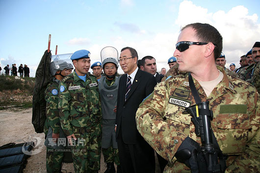 黎巴嫩當地時間17日,正在中東進行外交斡旋的聯合國秘書長潘基文在視察聯合國駐黎巴嫩維和部隊時,專程前往藍線接見了中國赴黎維和工兵營掃雷官兵。