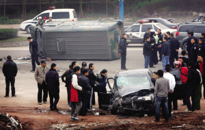一連串的巨響后,一輛運鈔車180度翻轉后重重地側翻在地,發生碰撞的轎車則朝前沖出10多米才停下。事故造成6人受傷。