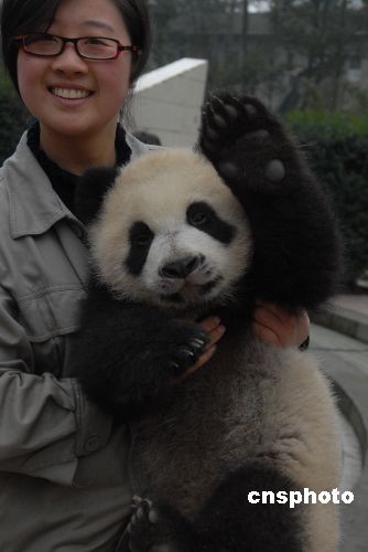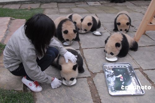 5.12汶川大地震,臥龍核桃坪熊貓基地遭到重創,為了保證國寶大熊貓的安全,臥龍50多只大熊貓被分批緊急疏散轉移,有27只熊貓轉移到成都、北京、福州等地寄養,其余轉移至雅安碧峰峽基地。自2008年7月6日早晨7:52和8:36,臥龍大熊貓“幗幗”順利產下全球首對雙胞胎之后,臥龍雅安基地2008年共有13只熊貓幼仔成活。2月12日雅安碧峰峽熊貓基地為這13只熊貓寶寶舉行簡單的入住熊貓幼兒園的儀式。中新社發 羅小韻 攝