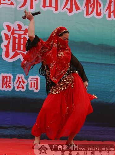 芙蓉姐姐身著新疆姑娘的服裝秀S造型。鄧昶 攝