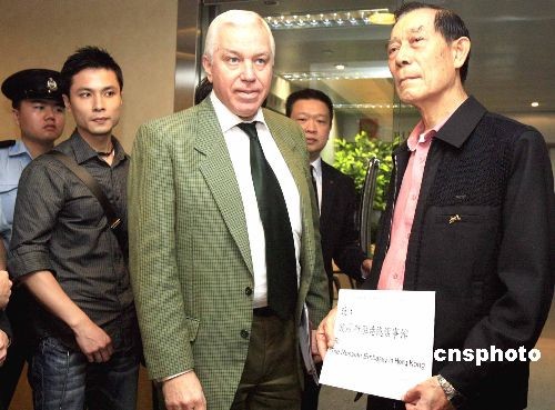 圖為香港海員工會主席郭錦華船長(右一)向俄羅斯駐港領事館工作人員遞交抗議書。中新社發 張勤 攝