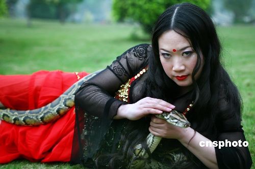 2009年2月21日,芙蓉姐姐應(yīng)邀參加南寧花花大世界首屆桃花節(jié)演出。演出結(jié)束后,到南寧動物園與蟒蛇共舞,拍攝寫真。據(jù)悉,這條蟒蛇名叫“金剛蟒”,長約3米,重15公斤。中新社發(fā) 駱文剛 攝