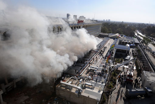 2月26日,位于巴基斯坦首都伊斯蘭堡的萬豪酒店發生火災,造成4人受傷。圖為消防人員正在滅火。