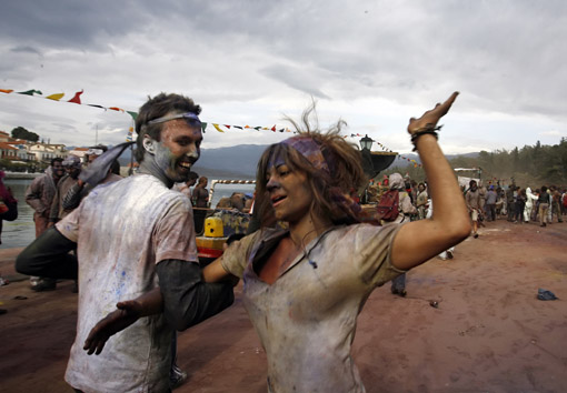 3月2日,人們在希臘雅典西北小城加拉希迪的街道上用加了各種天然顏料的面粉互相投撒,表達祝福。