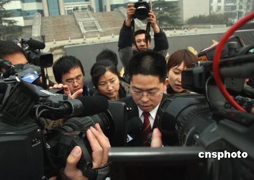 3月4日,三鹿集團部分破產資產在河北石家莊市中級法院公開拍賣。石家莊中級法院新聞發言人王偉向媒體宣布,三元集團與三元股份全資子公司河北三元以6.165億元人民幣拍得三鹿資產。圖為新聞發布現場。中新社發 翟羽佳 攝