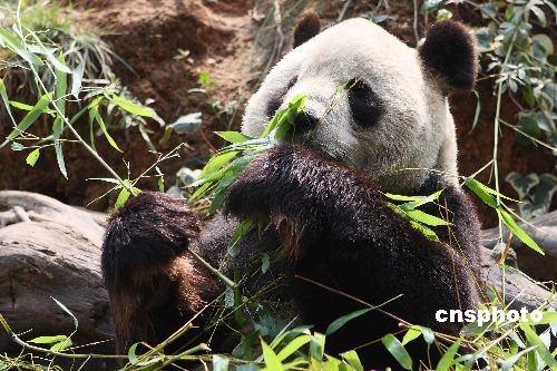 3月7日,一只大熊貓在云南野生動物園悠閑的享用美味竹葉。在“5·12汶川大地震”中,地處四川臥龍的中國保護大熊貓研究中心遭受重創。為了確保國寶大熊貓的安全,在地震發生之后,臥龍基地3只大熊貓被送到云南野生動物園暫養。日前,中國保護大熊貓研究中心專程來到昆明看望3只大熊貓。據悉,3只熊貓寶寶目前健康狀況十分良好。中新社發 保旭 攝