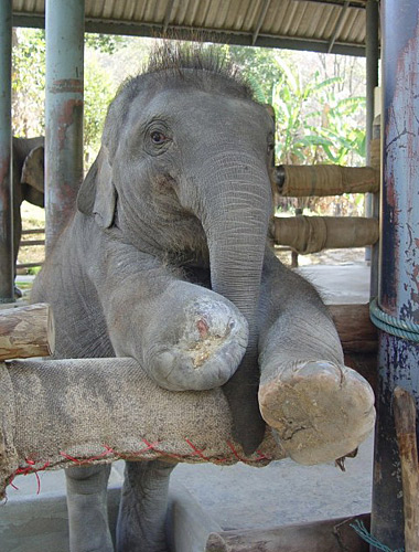 據悉,這只亞洲象名叫摩薩,當前已有3歲大。2007年不幸踩到地雷后,前右腿慘遭炸毀,醫生為其實施了緊急救治,并為其安裝假肢。摩薩目前已經逐步適應假肢,不久將會重返一個亞熱帶叢林。