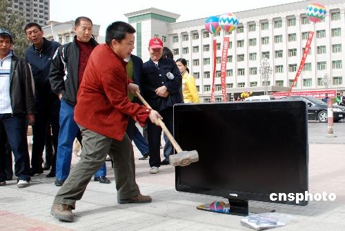 3月22日中午,在新疆庫爾勒市的中心廣場上,一名市民揚起榔頭對著一臺嶄新的47英寸飛利浦液晶彩電砸去,這臺電視瞬間變得七零八落。當事人稱,這臺電視剛買一個多月就出現故障,一直得不到售后服務,出此下策。中新社發 汪濤 攝