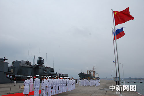 海軍南海艦隊副參謀長邢玉啟少將在碼頭上主持儀式,迎接俄軍艦到訪。華小平大校等海軍官兵出席了歡迎儀式。中俄海軍雙方還在碼頭接受了媒體共同采訪。