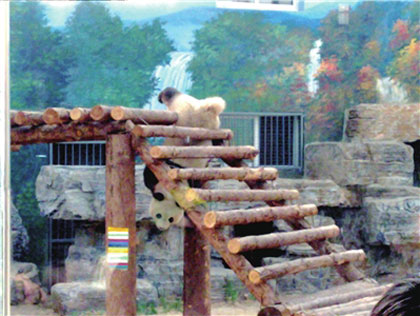 市民胡先生說,前天下午2點半左右,他來到奧運熊貓館參觀,看到一只憨態可掬、行動笨拙的大熊貓正在展示區的木制高架梯上溜達。