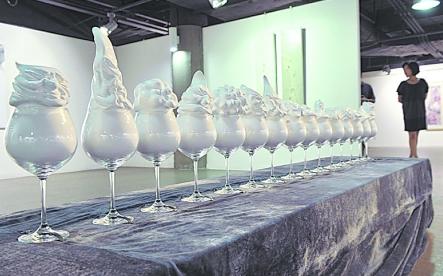 25日下午,記者在水碾河藍色空間畫廊內,在剛剛布展完畢即將在26日下午正式開展的“新生———西南地區美術院校在校生選拔展中美巡展”中國站展覽的展廳里,一組15個遠遠看去完全就是冰淇淋一般的雕塑作品立即吸引了記者的注意。這組名為《石膏達斯》的雕塑,全部是用高腳紅酒杯盛裝的,雪白的“冰淇淋”從杯底一直延伸到杯口,并形成各式各樣的宛如冰淇淋塔尖的形狀,但走近仔細觀看,卻發現這些冰淇淋塔尖其實都是一個個物體的變形,有汽車,有肯德基老人,有狗……25日記者通過電話聯系到了身在北京的參展藝術家、這些“冰淇淋”的作者張華,他表示,這些作品的靈感正是來自于冰淇淋,當時他覺得冰淇淋塔尖的形狀變換很有意思,于是想到了把生活中常見的消費場所、消費標志、人物、動物融入冰淇淋式的雕塑中,我覺得“這既是一種好玩的雕塑,又是一種反映消費社會現實的雕塑”。記者了解到,這些冰淇淋的雕塑售價令人咋舌:一組15個,售價5萬元,也就是說每個售價約等于3333元!