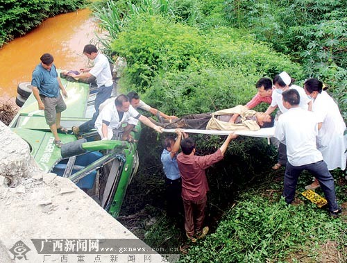 記者在現場找到客車司機,他說,事發時,前面有一輛摩托車發生側翻,他為避讓摩托車踩剎車,客車撞斷那花橋四五根護欄后,側翻在水溝邊。客車受到劇烈的摔落后受損嚴重,里面的乘客被困多人。他受傷較輕,急忙爬出來后,又鉆進車廂里救人,共救了幾個人。他說,客車從蘇圩發車前往南寧,當時車上只有30人左右,沒有超載。
