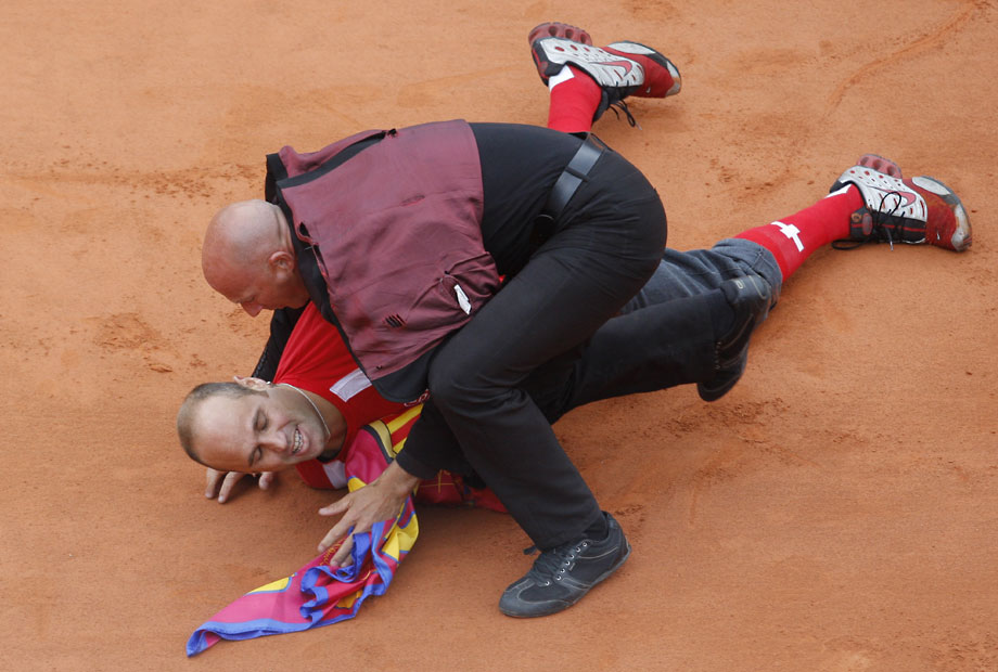法網男單決賽場上,一位費天王的癡心球迷沖入球場,強行將自制的一頂帽子戴到費德勒的頭上。安保人員及時出現,將狂熱粉絲架出場外。