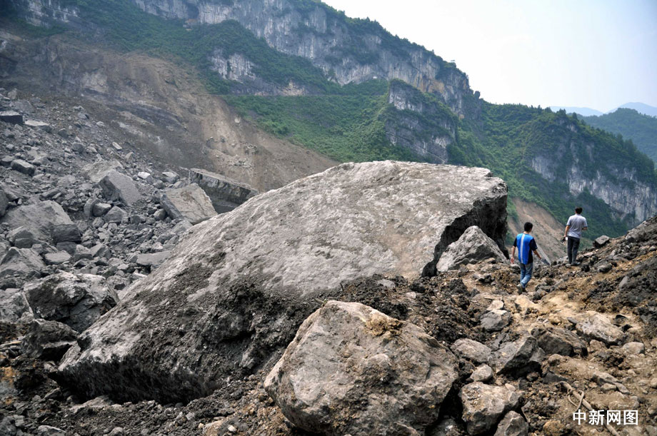 山谷谷底,從山體上垮塌而下的巨石隨處可見,這一塊高達(dá)20余米巨石和其他土石將三聯(lián)采礦場(chǎng)的礦井口掩埋。 曹多然 攝