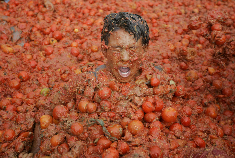 2009年6月14日,哥倫比亞第五屆番茄狂歡節開幕,參與者互相投擲西紅柿,盡情狂歡慶豐收。來自哥倫比亞各地的狂歡者們云集在首都波哥大東北部的蘇塔馬錢小鎮,街道上立刻變成了西紅柿紛飛的戰場。雖然每個人的臉上身上沾滿了西紅柿汁,但人們還是樂此不疲又是丟又是砸,把成堆的西紅柿當成打仗的“武器”。還有人特地穿上白衣白褲,身上越紅,心里就越痛快。