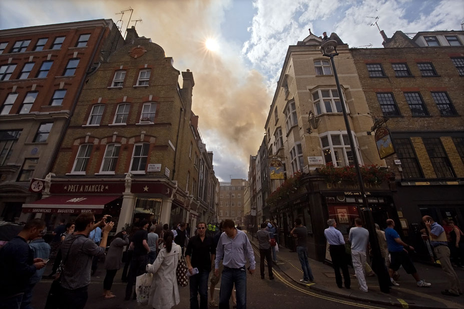 英國倫敦中部蘇豪區在當地時間10日下午2時左右發生火警,起火的5層高商業樓宇被嚴重焚毀,現場冒出大量濃煙,在倫敦市內多處均清楚可見。消防部門派出12輛消防車及60名消防員進行灌救。