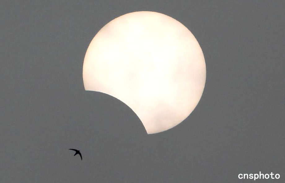 7月22日上午10點(diǎn)28分,北京上空出現(xiàn)的燕子爭相追逐日偏食奇觀。