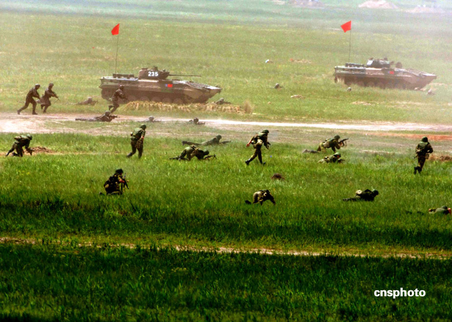 中國、俄羅斯兩軍總參謀長,7月23日上午到沈陽軍區洮南合同戰術訓練基地,觀看“和平使命2009”聯合反恐軍事演習。雙方以陸軍和空軍為主,中方參演部隊包括1個陸軍戰斗群和1個空軍戰斗群。俄方參演兵力包括1個陸軍加強摩步營、1個空降突擊連和部分空軍兵力,雙方投入兵力兩千多人。中新社發 宋吉河 攝