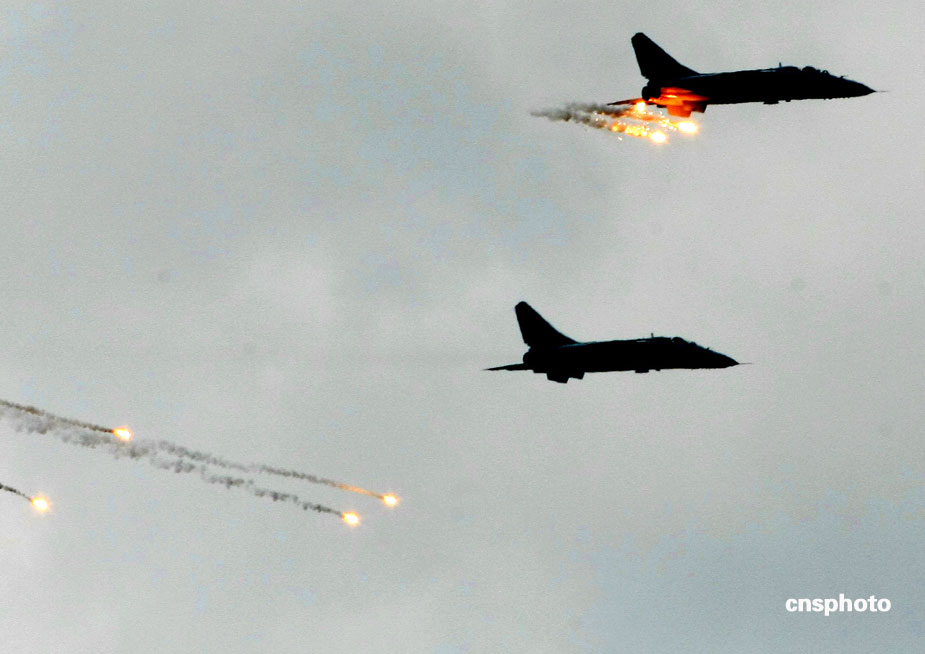 中國、俄羅斯兩軍總參謀長,7月23日上午到沈陽軍區(qū)洮南合同戰(zhàn)術(shù)訓(xùn)練基地,觀看“和平使命2009”聯(lián)合反恐軍事演習(xí)。雙方以陸軍和空軍為主,中方參演部隊包括1個陸軍戰(zhàn)斗群和1個空軍戰(zhàn)斗群。俄方參演兵力包括1個陸軍加強摩步營、1個空降突擊連和部分空軍兵力,雙方投入兵力兩千多人。中新社發(fā) 宋吉河 攝