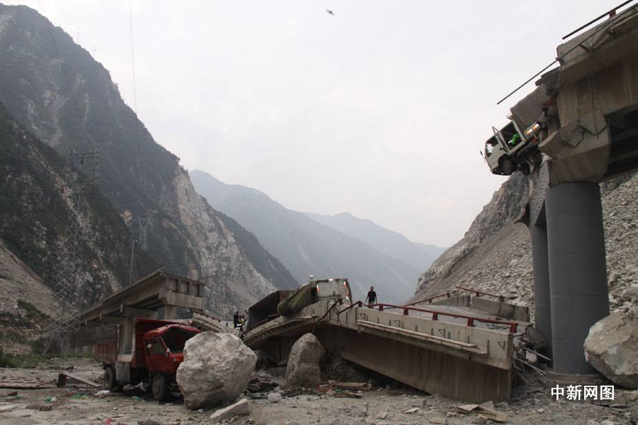 25日凌晨四點鐘左右,汶川縣境內國道二一三線徹底關大橋被山上飛下來的巨石砸斷,已造成100米的橋面坍塌,7輛汽車受損,12人不同程度受傷,3人死亡,都汶路通行中斷。汶新 攝
