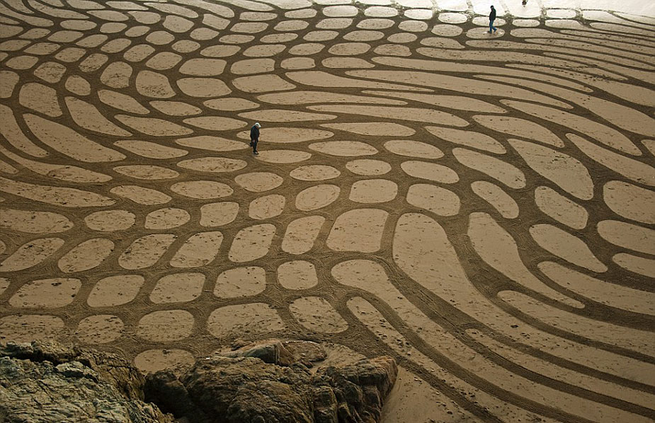 據(jù)英國媒體7月27日報道,藝術(shù)家Andres Amador用耙子在沙灘上作畫,眾多中心對稱的幾何圖形,不在乎是否能長久保留,但求被海浪帶走前與大自然的完美融合。