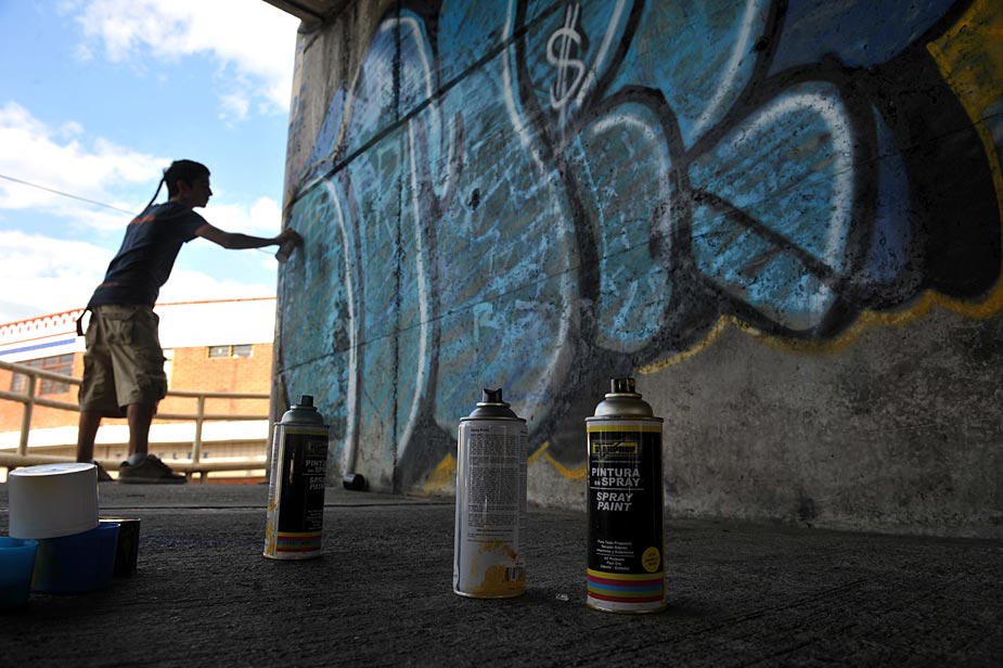 近日,哥倫比亞考卡山谷省卡利市的年輕人用涂料在墻上涂鴉,表達他們對世界的看法。