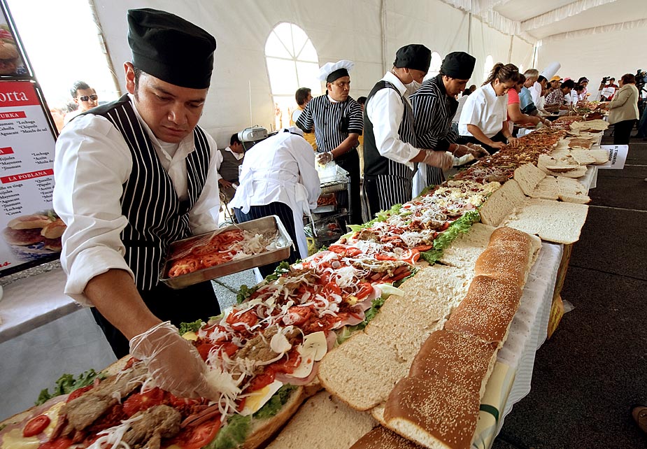 7月31日,在墨西哥首都墨西哥城舉辦的“墨西哥三明治節”上,200多人用肉、火腿、西紅柿、奶酪等各種餡料合作制成了長達46米的墨西哥三明治,試圖創造世界最長的墨西哥三明治紀錄。