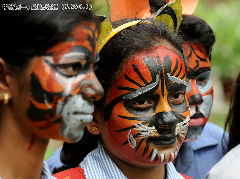 7月28日,約2000名學生在新德里化妝成老虎的臉譜,圍坐成老虎的造型。點擊觀看詳細內(nèi)容