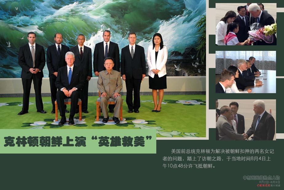 中新網(wǎng)本周熱點人物之克林頓——8月6日,美國前總統(tǒng)克林頓在平壤斡旋成功,朝鮮領導人金正日下令特赦在押的兩名美國女記者。三十二歲的凌志美、三十六歲的李承恩(前譯李尤娜)與克林頓所乘坐的飛機在洛杉磯附近的伯班克機場降落,兩名女記者下機時,與家人團聚激動得泣不成聲。