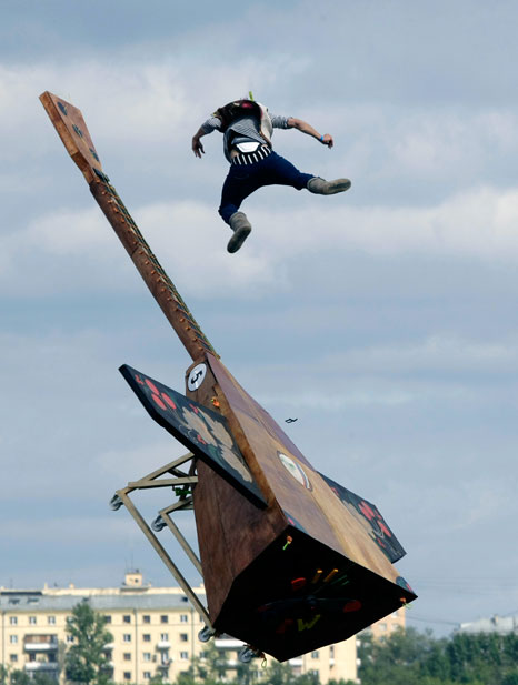 8月9日,莫斯科河畔舉辦一年一度的“墜落節(jié)”,表演者帶著自己設(shè)計制作的各種“飛行器”勇敢的從高空跳入水中。