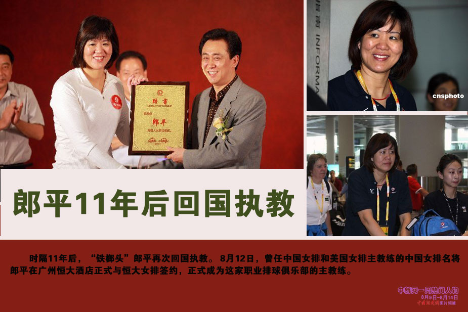 中新網本周熱點人物之郎平——曾任中國女排和美國女排主教練的中國女排名將郎平8月12日在廣州恒大酒店正式與恒大女排簽約,正式成為這家職業排球俱樂部的主教練。這標志著時隔11年,郎平再次回國執教。
