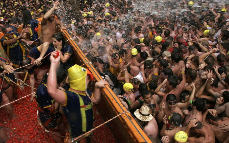 8月26日,西班牙東南部小鎮Bunol當日迎來傳統的西紅柿節。大約4萬名狂歡者在1小時內扔掉了11萬公斤西紅柿。來源:中國新聞網
