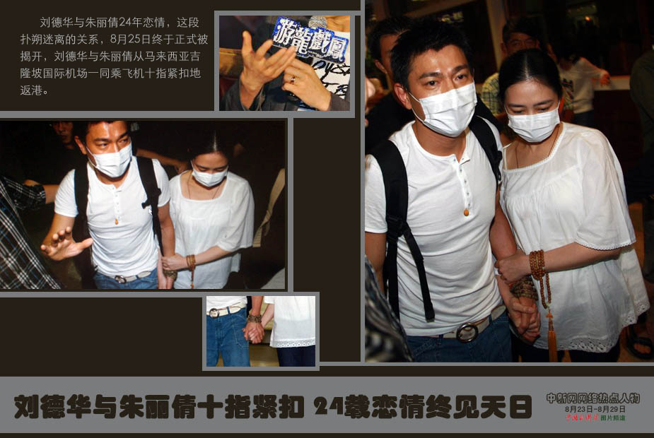 中新網(wǎng)本周熱點(diǎn)人物之——劉德華與朱麗倩 劉德華與朱麗倩24年戀情,這段撲朔迷離的關(guān)系,8月25日終于正式被揭開(kāi),兩人繼日前結(jié)伴到岳父墓前拜祭后,劉德華與朱麗倩從馬來(lái)西亞吉隆坡國(guó)際機(jī)場(chǎng)一同乘飛機(jī)十指緊扣地返港。