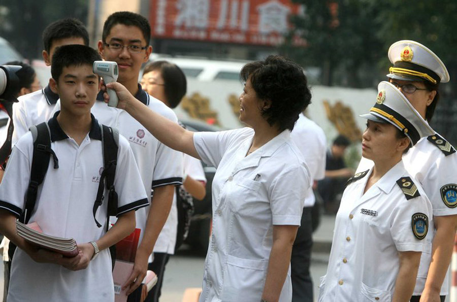 2009年8月31日,北京匯文中學,校門口北京市衛生局工作人員開始針對返校學生進行體溫測試。李木易/CFP