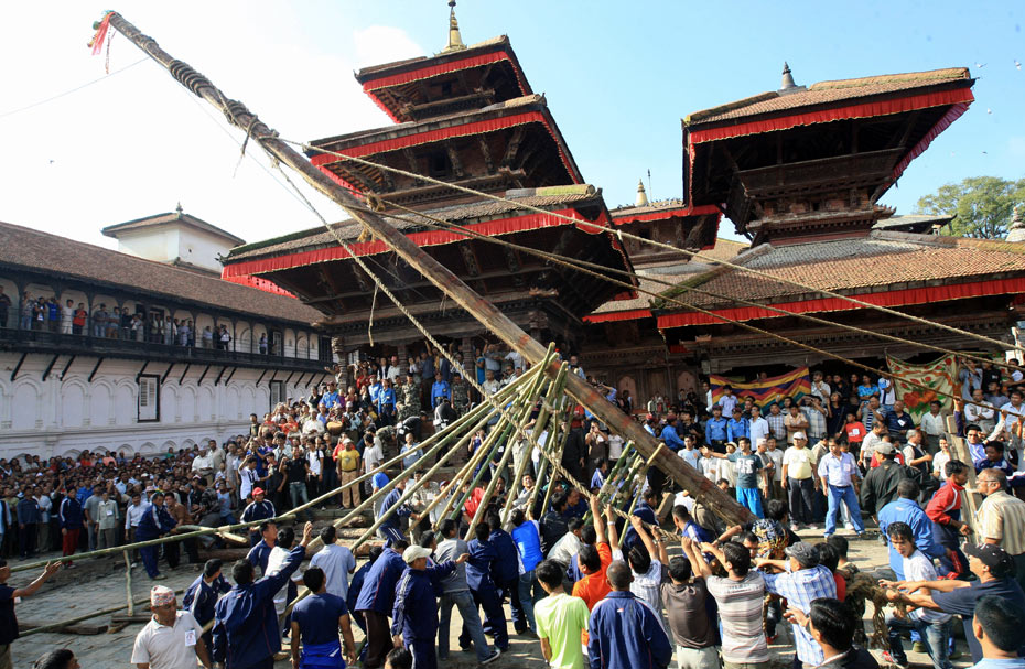 圖為節(jié)日當(dāng)天舉行豎立因陀羅旗桿(經(jīng)過(guò)密宗儀式并修飾過(guò)的一棵樹(shù)干)的儀式。