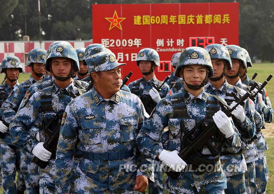 9月3日,解放軍官兵在位于北京郊區的一處徒步方隊閱兵村內訓練。今年國慶節將舉行新中國成立60周年國慶首都盛大閱兵儀式。來源:中國軍網