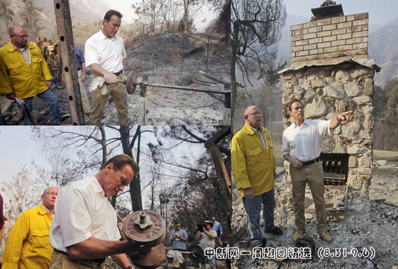 當地時間9月3日,加州州長施瓦辛格探訪了洛杉磯市圖洪加附近被火災燒毀的地區。圖片來源:中國新聞網