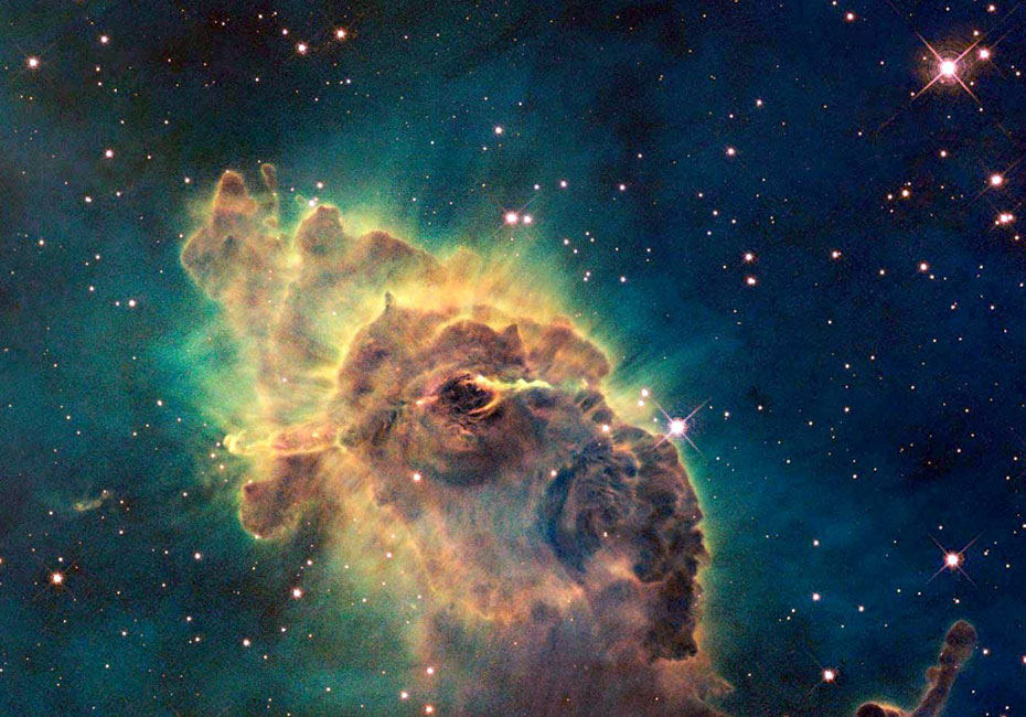 圖為哈勃望遠鏡上的相機拍攝的船底座星云中的由炙熱的氣體和塵埃組成的“創造之柱”。船底座星云位于距離地球7500光年的船底星座,是孕育恒星的地方。