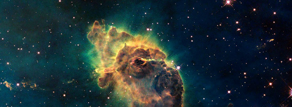 圖為哈勃望遠(yuǎn)鏡上的相機(jī)拍攝的船底座星云中的由炙熱的氣體和塵埃組成的“創(chuàng)造之柱”。船底座星云位于距離地球7500光年的船底星座,是孕育恒星的地方。