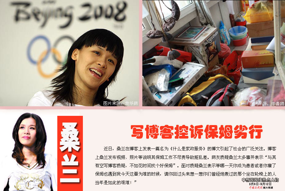 中新網(wǎng)本周熱點(diǎn)人物之——桑蘭 近日,桑蘭在博客上發(fā)表一篇名為《什么是家政服務(wù)》的博文引起了社會(huì)的廣泛關(guān)注。博客上桑蘭發(fā)布視頻、照片等說明其保姆工作不盡責(zé)導(dǎo)致臟亂差。有網(wǎng)友質(zhì)疑桑蘭太多事并表示“與其有空寫博客質(zhì)疑,不如花時(shí)間找個(gè)好保姆”。面對質(zhì)疑桑蘭稱“別以為‘輪椅事件’ ‘神醫(yī)門’‘保姆門’就認(rèn)為我是個(gè)怨婦或者那么唧唧歪歪。等哪一天你坐上輪椅乘飛機(jī),你成為患者或者你雇了保姆也遇到我今天這番為難的時(shí)候,請你回過頭來想一想你們曾經(jīng)炮轟過的那個(gè)坐在輪椅上的人當(dāng)年是如此的艱難!”
