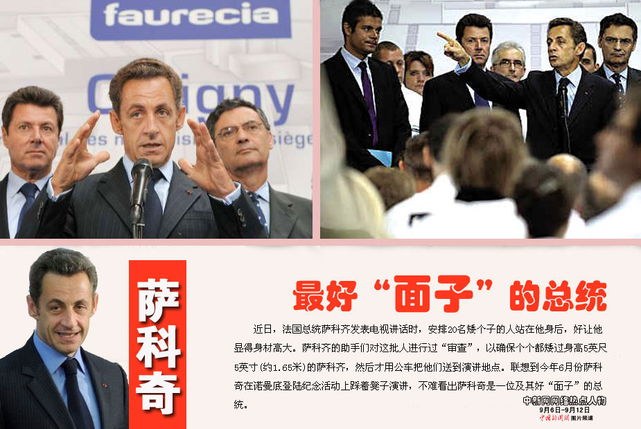 中新網本周熱點人物之——薩科奇 近日,法國總統薩科齊發表電視講話時,安排20名矮個子的人站在他身后,好讓他顯得身材高大。薩科齊的助手們對這批人進行過“審查”,以確保個個都矮過身高5英尺5英寸(約1.65米)的薩科齊,然后才用公車把他們送到演講地點。聯想到今年6月份薩科奇在諾曼底登陸紀念活動上踩著凳子演講,不難看出薩科奇是一位及其好“面子”的總統。