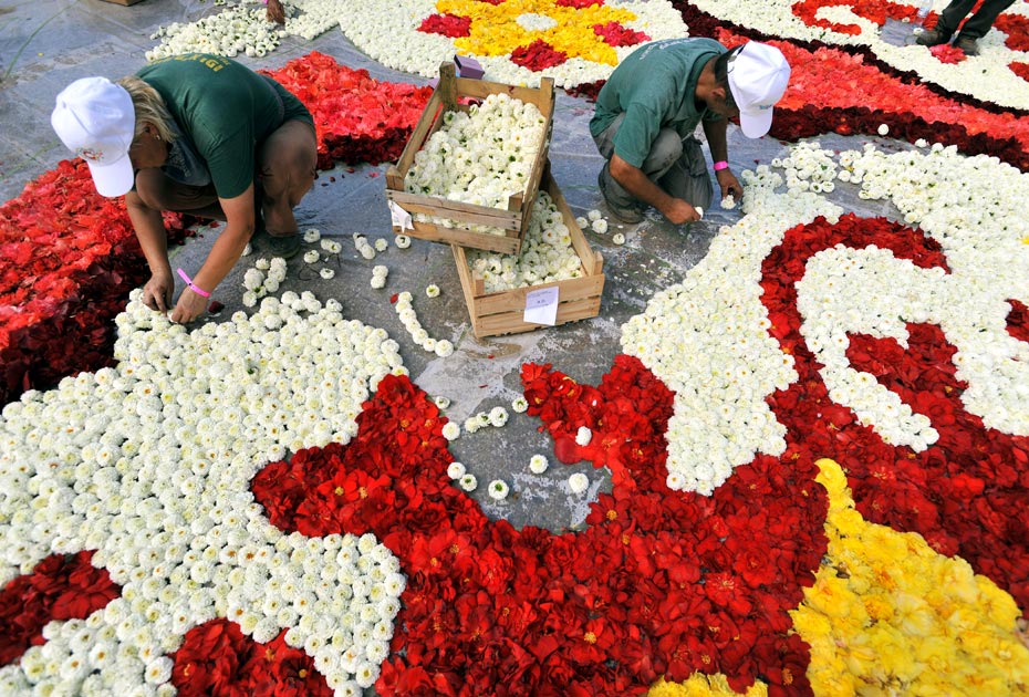 據悉,原本計劃全部使用以色列的鮮花,但由于當地的鮮花產量不足,只能從布魯塞爾進口,這批鮮花每朵花的直徑都在20厘米左右。百名志愿者們費時7小時精心鋪成了這張花毯,這張鮮花地毯將展示三天,隨后將被生態埋葬。