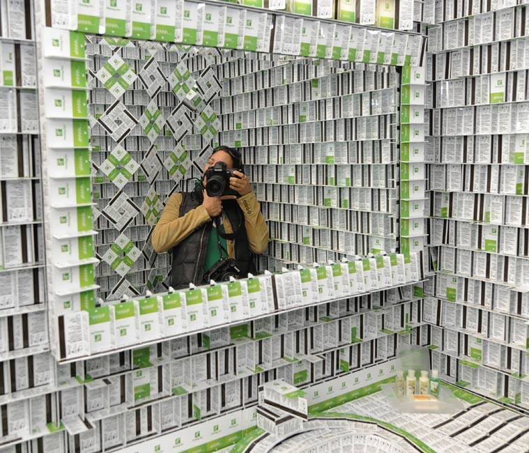 9月17日,在美國紐約,一位名叫布賴恩的設(shè)計(jì)師展示他利用房門卡設(shè)計(jì)的客房。這個占地約37平方米的酒店接待大廳、臥室和衛(wèi)生間是利用20多萬張房門卡搭建而成的。