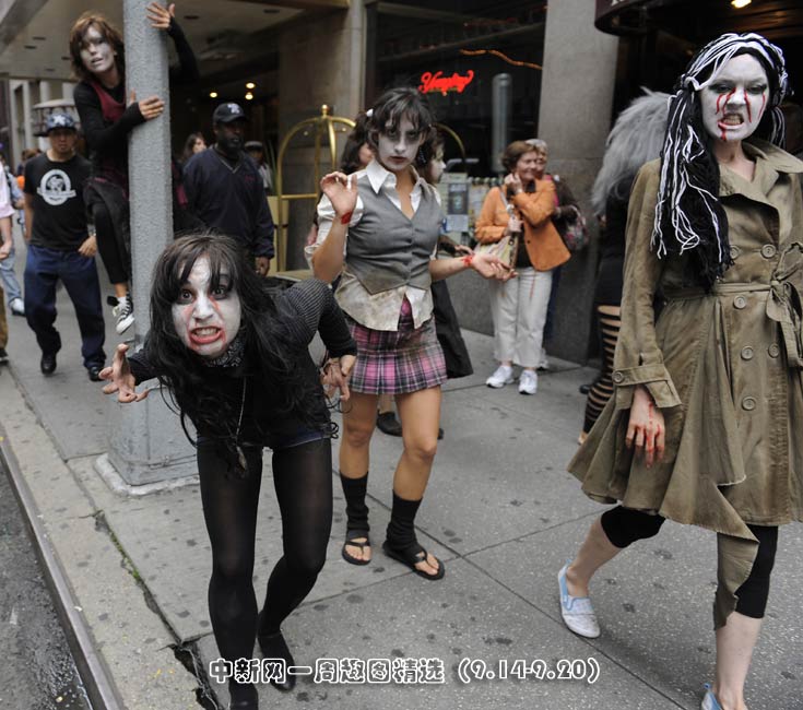 當?shù)貢r間9月16日,在美國紐約時代廣場,一群演員裝扮成僵尸的樣子,在街頭行走,提前為下個月到來的萬圣節(jié)造勢。圖片來源:中國新聞網(wǎng)
